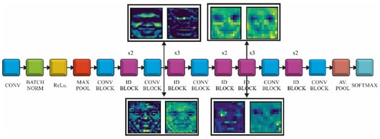 The feature maps for two layers of ResNet model are presented in Figure 13. The first set of images were captured after the second convolutional block. At this point, the feature maps had high resolution and focused on sparse areas of the face. The second set of images was taken from the second convolution of third ID block. It could be observed that at this point the filters were concentrated on particular areas, such as eyes, mouth, teeth, eyebrows and the representation of the feature maps was more abstract.