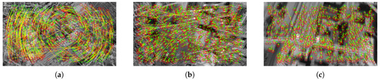 where , , , and k is a parameter of the method. This procedure is applied to increase the robustness of the method. The corresponding keypoints after removing faulty matchings are shown in Figure 4.