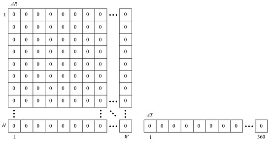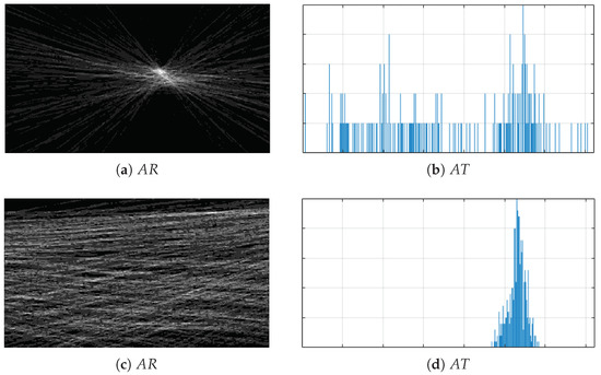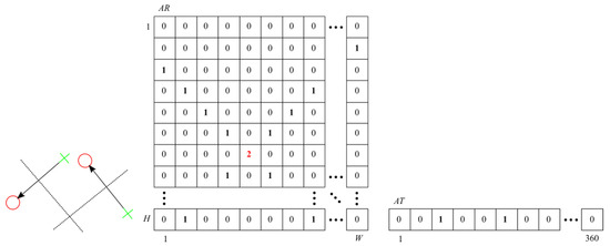 To find the temporary position of the rotation axis and the dominant direction of the shift vector, a voting scheme, similar to that used in the Hough transform, was applied [40]. Two so-called accumulator matrices: () and (), were created and filed with zeros. W and H denote the image width and height, respectively (Figure 5).