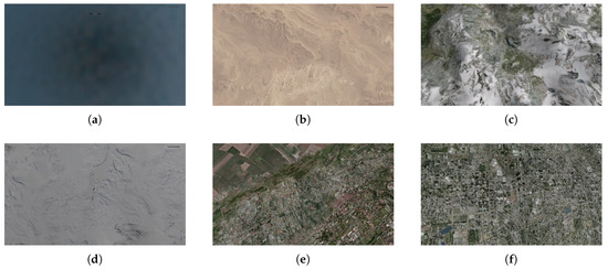 Selected frames from test videos in group 2: (a) ocean, (b) desert, (c) mountains, (d) arctic, (e) urban1, (f) urban2.
