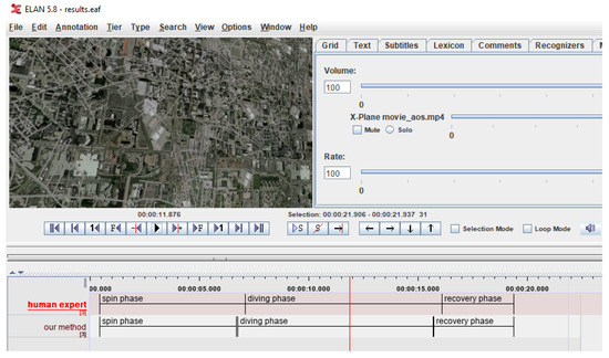 Each frame of the manually extracted video fragment corresponding to the entire spin recovery procedure was processed. Manual annotations created by an expert in ELAN—the popular annotation tool were used as a ground truth [44,45]. Results returned by the described method implemented in Matlab were automatically saved in the ELAN file using the annotation API [46]. Qualitative assessment of the results was made by visual comparison of both annotation layers (Figure 13).