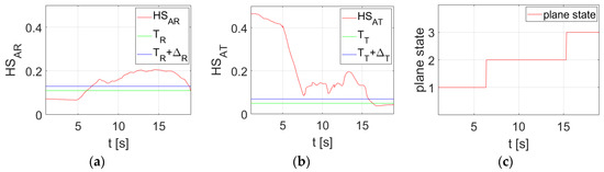 The graphs obtained for the selected test video are shown in Figure 14. In Figure 14a,b, the red lines show the histogram spread measure for AR and AT, respectively. The green lines correspond to the selected threshold values TR and TT. The blue ones show thresholds increased by deadbands TR + ΔR and TT + ΔT. Figure 14c shows the state of the aircraft during spin recovery.