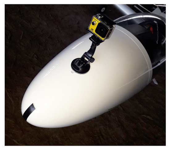 Preliminary experiments for test videos registered during the glider flights were also performed. Flight tests were carried out in September, from 17:00 to 19:00, over the agricultural and forest area, at an altitude of 1500–500 m AGL (Above Ground Level), in CAVOK (Ceiling and Visibility OK) meteorological conditions. The camera was attached to the bow. Its optical axis was approximately parallel to the longitudinal axis of the glider (Figure 17).