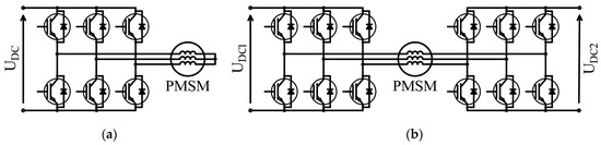 Conventional 3-leg inverter driving a permanent-magnet synchronous motor (PMSM) (a) and dual-fed open-ended winding PMSM (b).