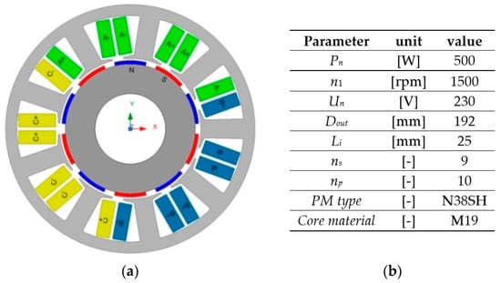 Next, the proposed method has been applied to demonstrate the effect of harmonic injection on an FSCW PMSM with a surface-mounted permanent magnet (SPM) rotor. The structure of the magnetic circuit and the main parameters of consideration in the case study problem machine are shown in Figure 2. A tested PMSM consists of nine stator slots (ns) and 10 magnetic poles (np). Due to the high value of the least common multiple of np and ns, the value of the cogging torque is low. Moreover, the shape and dimensions of the magnetic circuit in the machine are initially optimized by FEA in order to reduce the torque ripple level.