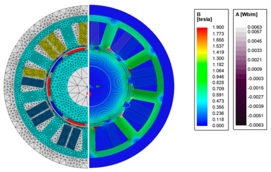 To assess the impact of current harmonics on the level of electromagnetic torque ripples, the numerical model of studied PMSM was developed in the ANSYS Maxwell environment. The considered domain was subdivided into about 25,000 triangular elements. The applied finite element (FE) mesh and exemplary magnetic flux density distribution are shown in Figure 3. A time-stepping algorithm was employed and the period Tf of the fundamental harmonics was divided into 1500 steps. Equations (2) and (5) were implemented in the developed model in order to perform a current waveform shape optimization.