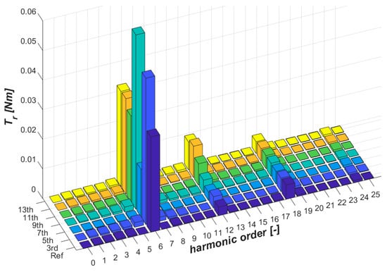 When comparing the obtained results to the referenced case (the machine was supplied by the fundamental harmonic denoted as Ref in Figure 4), it can be seen that all the studied harmonics have an impact on the torque ripple level. Nevertheless, only in the cases of the 5th, 9th and 13th harmonics was a reduction in the amplitudes of particular torque ripple harmonics observable. At this first stage, the proper phases of these particular harmonics were searched for.