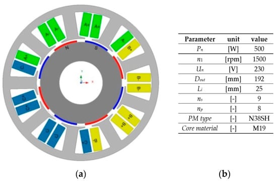 Structure (a) and major parameters (b) of studied PMSM (second structure of ns/np equal to 9/8).