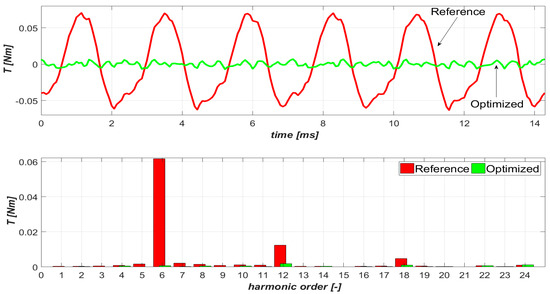 The structure of the PMSM that was examined second is shown in Figure 6, while the determined torque ripple waveforms Tr and their harmonic contents for fundamental (reference) and optimized current harmonics are shown in Figure 7.