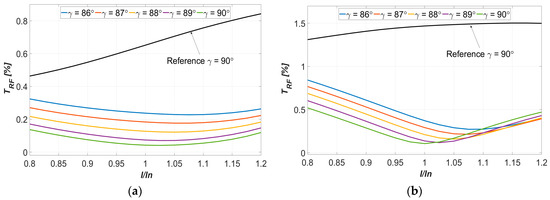 The optimization of the supply current harmonics was carried out for the rated operational conditions of the studied machines (i.e., rated speed, torque and current values). In practice, the PMSM machines usually work with variable torque loads (corresponding to the supply current value), as well as the torque angle γ, which can be slightly different to 90°. To assess the robustness of the proposed approach, the torque ripple factor was determined for the current value in the range from 0.8 to 1.2 of the rated current and γ in the range from 86° to 90°. The characteristics of TRF, obtained as a function of the relative current, have been compared to the characteristics of the reference sinusoidal supplied machine (i.e., the machine without harmonic injection); see Figure 8a,b, respectively, for the machines with 9/10 and 9/8 ns/np ratio.