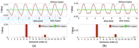 In the last stage, the impact of triplen harmonics was examined. The calculations were performed for the optimized current shape (i.e., determined harmonics phases and amplitudes, including triplen harmonics), in case (a) and, in case (b), for the phase current waveforms without triplen harmonics, i.e., IP3 = IP9 = IP15 = 0. The torque ripple waveforms and their harmonic contents for both machines studied were compared in Figure 9a,b, respectively.