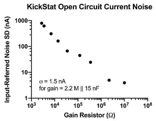 Open circuit current measurements with calculated input-referred noise. Noise decreases as the gain resistor increases.