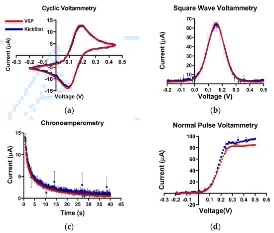 Quantitative comparisons between KickStat (blue) and the commercial device (red) while measuring 5 mM potassium ferricyanide with different electrochemical techniques. (a) Cyclic voltammetry, (b) square wave voltammetry, (c) chronoamperometry, and (d) normal pulse voltammetry. Peak values of the current are within 9% for each measurement across each electrochemical technique. Each data point shown for each device is the average of 3 sequential runs. Error bars represent standard deviation and are smaller than the points plotted. Voltages are referenced against an Ag/AgCl reference electrode.