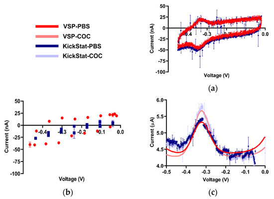 Qualitative comparisons between KickStat (blue) and the commercial device (red) while measuring cocaine biosensor. (a) Comparative readout of the cyclic voltammogram for the cocaine aptamer in phosphate-buffered saline (PBS) displaying minimal redox peak separation characteristic of an adsorbed species, indicating successful functionalization of the electrode, (b) Cyclic voltammogram with the lower resolution LMP91000 stock voltage reference generator and corresponding points using the commercial device. Peaks are not discernible by eye or by commercial device’s software, making analysis of the electrochemical current virtually impossible, (c) Square wave voltammograms in PBS and 0.5 mM cocaine hydrochloride. Data points shown for each device are the average of 3 sequential runs. Error bars represent standard deviation and are smaller than the points plotted in many cases. Voltages are referenced against an Ag/AgCl reference electrode.