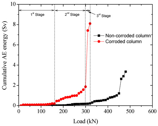 - The AE characteristics of RC columns are in strong agreement with the macroscopic mechanical behaviors observed during the loading and failure process. The reinforcement corrosion considerably affects the mechanical performance of columns, causing the concrete cover to spall during compressive loading.