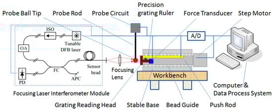 In order to effectively measure the displacement change of the probe ball tip, the measurement principle established in this paper is shown in Figure 3. The movement axis of the grating ruler and the axis of probe movement are collinear in the measurement direction. The probe is fixed on a workbench. The computer controls the step motor to drive the push rod to move towards the probe at a certain speed, and the displacement is measured by the precise grating ruler. The displacement of the probe ball tip is measured by a laser focusing displacement sensor based on the principle of laser interference displacement measurement [22,23], which focuses the measurement light emitted by the laser on the probe ball tip, and the probe ball tip then reflects the measurement light to the laser head. After the signal processing inside the laser head, the displacement change of the probe ball tip can be obtained.