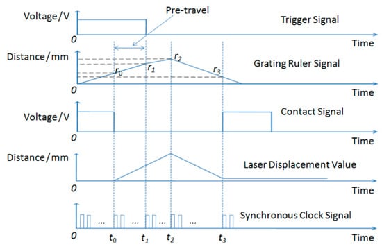 The measurement process is as follows, and the time sequence change of the calibration system during measurement is shown in Figure 4. Before calibration, the push rod does not touch the probe ball tip. At the beginning of calibration, the computer controls the step motor to drive the push rod forward to approach the probe ball tip, assuming that the value of the grating ruler fixed on the push rod at the moment the motor starts is zero. Because the laser is used to monitor the change of probe position, the displacement value of the laser interferometer does not change before the push rod touches the probe ball tip, assuming that the laser value is zero at this time. The pushrod continues to be driven forward until it just contacts the probe ball tip, the laser value begins to become non-zero, and the contact signal changes from high level to low level. The time of the contact instant is recorded as t0 and the grating displacement value as r0; meanwhile, the time and the value are sampled and stored in the computer. The push rod continues to move forward until the trigger signal of the probe occurs; the trigger signal then changes from high level to low level, and the computer records the time of the trigger moment t1 and the grating ruler displacement r1. When the computer control system receives the trigger signal from the probe circuit, it stops the step motor immediately according to the control program. Because of the control strategy and the existence of machine inertia, the push rod will still push the probe ball tip a certain distance (the smaller the inertia, the smaller the distance) forward; the system records and stores the grating ruler displacement as r2 and the time at the moment the push rod stops as t2. Then, the computer controls the motor to drive the push rod to return to its zero position. Because of the mechanical characteristics of the trigger probe, the probe cannot return to its initial zero position, so there will be a return-to-zero error. When the laser displacement value does not change, the grating displacement r3 and the time t3 are recorded and stored, and the contact signal changes from low level to high level.