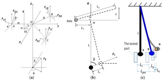 In Figure 5a, FLi (i = A, B, C) is the support force of the right support ball to the probe positioning pin at point I; FRi is the support force of the left support ball to the probe positioning pin at point i; α is the included angle of FLA and the connection line of the two supporting ball centers at point A; β is the included angle of FRA and the connection line of the two supporting ball centers at point A. The included angles at point B and point Care the same as that at point A. K is the sum of the spring pre-pressure force on the probe and the probe gravity. t is the distance between the force K and the center of the mass of the probe, that is, the eccentricity. δ1 is the angle between the line from the gravity point O of the probe to the point H of the force K and the positive direction of the X axis. The distance between point A and the center of the probe is m; the distance between point B and the center of the probe is g; the distance between point C and the center of the probe is s; the distance between the center of the probe and the center of the probe ball is L.FT is the measuring force when the probe contacts the tested part to generate the trigger signal; δ is the angle between the force FT and the positive direction of the Z axis; θ is the angle between the projection line of the force FT on the XY plane and the positive direction of the X axis; r is the radius of probe ball tip.