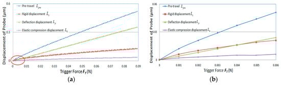 According to the above mathematical model, and considering that the trigger force given by the manufacturer is generally less than 0.2 N, the mathematical model was simulated based on Matlab software [26], and the type and parameters of the probe and the selected materials were the same as those used in the Section 4. The simulation results are shown in Figure 6.