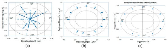 From Figure 8a, we can see that the error range of the trigger repeatability of the probe is different in different directions. The error range in the direction of angles60°and 90° is very small (the smallest error range is 0.03 μm), and the error range in the directions of 30°,120°, 240°and 260°is very big (the largest error range is 0.058 μm). The average error of the trigger repeatability is 0.02 μm.