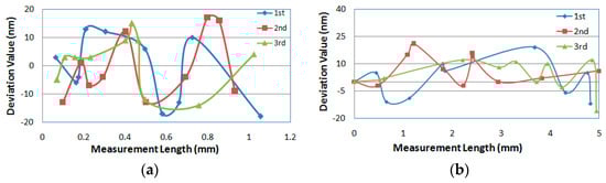 From Figure 9a, we can see that the variation trend of the deviation value of the three measurement results is basically the same. However, in Figure 9b, we see that the variation trend of the deviation value of the three times measurement results is not the same, which may be due to a slight random drift of the accuracy correction of the calibration device over time over a large length. However, it is clear from Figure 9 that the maximum error of the displacement measurement of the device is less than 20 nm.