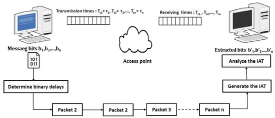 In the experiments of this study, the sender and the receiver did not require synchronized clocks between them but did need (individual) clocks with sufficient accuracy. Therefore, the PC devices’ crystal-controlled clock was used to govern timing. It is necessary to understand the process of encoding covert information and sending this data between the sender and the receiver from both sides. First, the sender generates a secret message, then converts the messages’ characters to binary format and saves it as a text file. Then, the binary covert packets will inject in the legitimate packets by modulating the transmission times of these packets by adding extra buffering delays denoted by (), to each element of the original covert sequence of information, as shown in Equation (2).