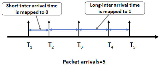 On the receiver’s side, the receiver records the sequence of receiving times of network packets corresponding to each binary covert packets. Then, the sequence of inter-arrival times of maps to the n-bit binary sequence same as shown in Figure 2, where . In the last step, the binary symbols re-organized to reassemble the original message.