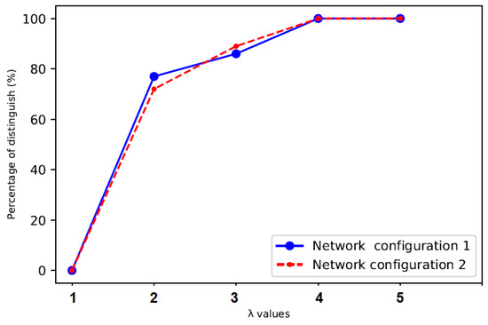 The experiment results in Figure 3 show the accuracy is in both network configurations when is a quarter the mean inter-arrival time of legitimate traffic. More covert traffic are counted close to the legitimate traffic, making the time range of covert traffic overlaps with the time range of legitimate traffic and the distinction between them hard. However, when value increased, such as in cases 2 and 3, the percentage of distinguishing between covert traffic and legitimate traffic increased as well, which becomes possible to distinguish between them with a significant degree between 70–80%. The accuracy reached when is a double the mean inter-arrival times of legitimate traffic in both network configurations. Therefore, using the threshold of packet delay that are less than the double mean inter-arrival times of legitimate traffic, makes a small difference between the time ranges of covert traffic and time ranges of legitimate traffic. Furthermore, in both network configurations, at any time after the double mean inter-arrival times of legitimate traffic, the accuracy will remain at . This indicates that it is easy to distinguish covert traffic from legitimate traffic. Based on that, covert timing channels will be dangerous in the case of malicious applications or secure for confidential applications.