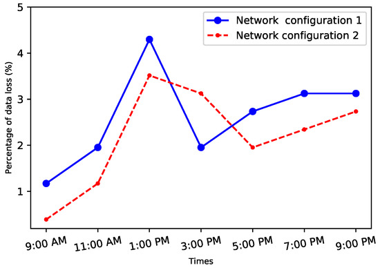 In this study, the sender and the receiver were assumed to have gained control over one of the systems’ resources. They started by conducting an investigation of the network characteristics around the system, with the intent of discovering the optimal parameters of the network environment. For example, finding the time when the network uncongested to use this time for leaking the highest amount of information, such as Figure 4 shows the loss of data at different time windows to explore the congestion issues in different environments. The results show the highest losing of data was at rush hours between 11:00 a.m. and 1:00 p.m.