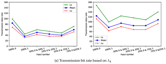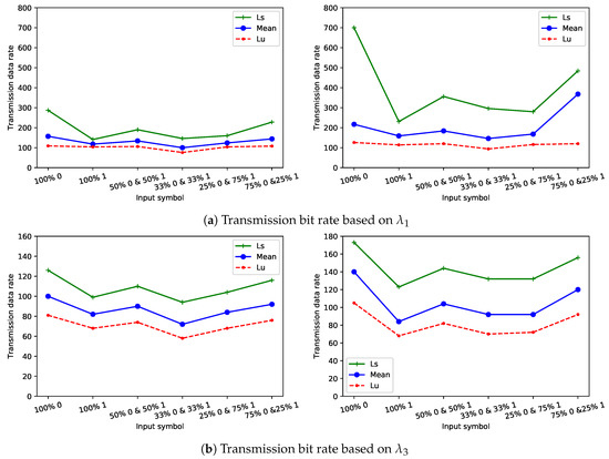 where is the time duration needed to send a binary data stream with length is 4 bits; is the number of zeros in the 4-bits stream; is one of the three values of , mean, or for bit 0, is the number of ones in the 4-bits stream; and is one of the three values of , mean, or for bit 1. In Equation (8), a data stream with a size is 4 bits was chosen for simplicity to calculate the transmission bit rate based on the percentage of zeros and ones in the covert information. For example, in the scenario that introduces zeros and ones at delay s and delay s in network configuration 1, where the minimum values () in the range of inter-arrival times for zeros and ones are and , respectively, the 4-bits stream contained 3 bits of zeros and 1 bit of ones, and the time duration to send these 4 bits was equal to ( s. Then, the number of streams that needed to transmit the 4 intermixed binary encoded symbols based on the time duration of the bits determined in Equation (8) was defined in the following formula: