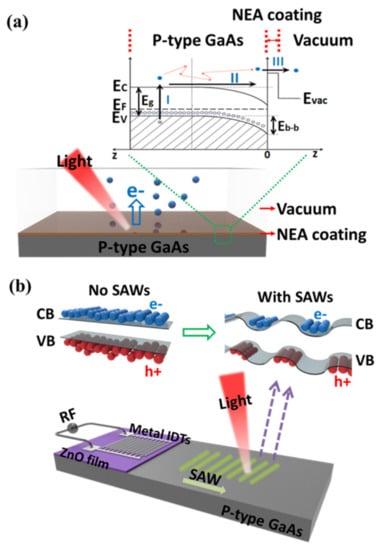 (a) The bottom is a three-dimensional (3D) schematic view showing the photoemission from p-type doped GaAs surface with a thin negative electron affinity (NEA) coating. The inset is a band diagram demonstration of the three-step photoemission mechanism: I. photoexcitation, II. transport, III. emission from the surface. (b) The 3D schematic view at bottom shows the concept and structure of our surface acoustic wave (SAW) device used to generate SAWs on p-type doped GaAs substrate. Top left—the result of photoexcitation without SAWs. Top right—the band bending effect caused by SAWs. In this case, the electrons and holes are spatially separated, thus the recombination is suppressed.