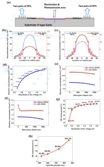 According to the literature [16], the absorption depth in GaAs is dependent on the wavelength of incident photons. To evaluate the QE improvement as a function of the light wavelength, we used different absorption depths corresponding to varied incident photon energies, which are 1.45 eV (855 nm), 8 um; 1.69 eV (734 nm), 3 um; 2.07 eV (600 nm), 1.5 um; 2.39 eV (520 nm), 1 um [16]. In this set of simulations, all other parameters including the structure of IDTs and bulk p-type GaAs model, the parameters of the SAW, and the applied AC voltage were the same as those described in Figure 2a. The simulation and calculation result of the QE enhancement due to the SAW is shown in Figure 2h. According to the result, the effect in bulk GaAs was strongly pronounced for , i.e., for photon energies approaching the band-gap, leading to enhanced QE for the photons of longer wavelengths.