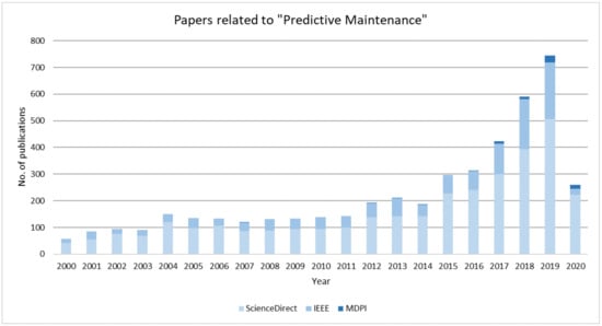 The published papers on predictive maintenance from 2000 to 2020 on MDPI, ScienceDirect and IEEE.