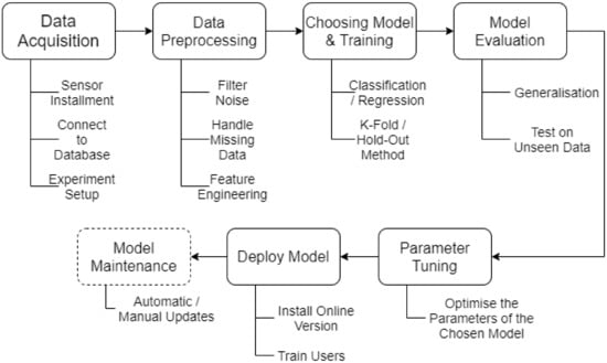 It seems that a consensus on how a model should be build have somewhat been reached within literature. Though, the order of the steps might be defined or prioritised differently, the same steps tend to be included. Figure 4 depicts an overview of the common steps taken to develop a machine learning model. Data Acquisition refers to the gathering of data. With the deployment of communication technology, sensors have been a key source of data, sending and storing data in databases. Data Preprocessing is the steps taken to prepare the data. A taxonomy, suggested by Cernuda [25], prepares six steps to consider and is displayed in Figure 5. The exact order depends on the data being worked on. Choosing Model & Training considers the amount of available models and the task of training it. In some literature, these are split into two steps, which the authors also consider a possibility. The amount of models available has rapidly increased and gaining an overview can be a challenge, thus finding an appropriate model requires testing. In the paper by Lee et al. [2], a table over a set of models and tools have been proposed alongside their corresponding strengths and weaknesses. A paper by Fernandez-Delgado et al. [26] present an extensive study on various machine learning techniques. Training can often be used as a basis for choosing a model, due to the training commonly giving an indication of the model performance. Methods commonly deployed in literature to evaluate training performance is the k-fold method and hold-out method. The k-fold method splits the data such that a kth of the data is used to predict upon and the rest for training, this being iterated k times. The hold-out method is often recommended for larger data sets. This method takes out a percentage of the data to be predicted upon, where the rest is used for training. Model Evaluation considers the performance of the model on an unseen test data set. This allows the developer to determine how the model potentially will perform prior to being deployed. Analysing whether the model accuracy found in training aligns with testing. Parameter Tuning allows for optimising the accuracy of a model. Machine learning models operate with different parameters to allow for flexibility and to increase or reduce bias. The last two steps consider deploying and maintaining the model. Deploying the system can relate to installation or integration of software, while it can also refer to soft values, such as Change Management for the customer to adopt the new tool and use it for decision-making. Model maintenance considers that systems often are dynamic, where a common assumption on a model is that the system is static [27].