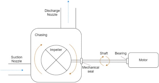 A centrifugal pump consists of several rotating and static components that has the task of displacing liquids. Due to the interaction of moving parts and liquids interacting with a solid and static surface, several errors can surface. A thorough investigation by Forbes [9] resulted in a conclusion of dividing the main issues of a centrifugal pump into 13 types of faults. Each of the 13 types of faults could then further be divided into more specific reasons for the fault happening. Table 4 presents an overview of detectable errors with their corresponding data tags that might be of interest. To get a more detailed description of specific issues, the reader is recommended to visit Forbes [9]. The main components of a simple centrifugal pump will consist of an impeller, a suction nozzle, a discharge nozzle, a shaft, a mechanical seal, and several bearings. A more detailed overview can be seen in Figure 6. Due to the nature of the pump, the pump faults can be categorised into three categories. Hydraulic, mechanical, and other failures. The hydraulic failures are caused by the liquid flowing within the piping. The state of the liquid can influence the performance of the pump, but also damage parts of the pump. Mechanical failures refer to the interaction of moving and static parts, this commonly causes wear or other types of fatigue. Finally, other type failures are a category for failures that do not directly fall into the two other groups. The power consumption of a pump can often be an indicator of whether the pump is performing desirably.