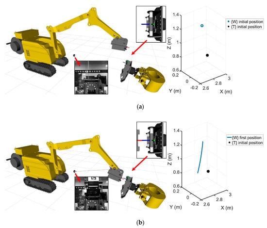 In the experimental data, 0–9.6 s represents the first stage, which was the initial stage in the process of the tool head replacement. Figure 9a shows the experimental data at the beginning of the first stage. The left side of the figure shows the real-time 3D model of the robot (the oil cylinder model is omitted), the image obtained by the camera, and a magnified partial overlooking view at the attachment dock spot. On the right side of the figure, the initial 3D position coordinates of {W} (2.777, 0, 1.284) and {T} (2.863, 0.002, 0.826) are shown. At this stage, the reference coordinate frame {R} did not appear in the view of the camera {C}. The movement of {W} was controlled downward until the camera successfully captured the reference coordinate frame {R}, which was at a time of 9.6 s. The first stage ended at this point (and the second stage began at this point). Figure 9b shows the experimental data at the end of the first stage at a time of 9.6 s. The blue curve on the right is the movement track of {W} at this stage. {W} moved to (2.696, 0, 0.858) at 9.6 s.