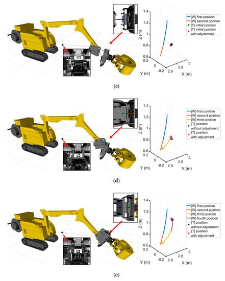 At 40.2 s, the process of attachment changing was completed. The end device of the robot and the attachment conducted the hydraulic oil line and locked up through the hydraulic quick-hitch joint. At this time, the end device of the robot and the attachment were firmly connected, and {W} and {T} were always aligned. During the fifth stage, the end device and the attachment were controlled to rotate counter-clockwise around joint {3}. Figure 9f shows the experimental data in the fifth stage at 52 s, where the position coordinates of {W} were (2.894, 0, 1.336), the position coordinates with the error compensation of {T} were (2.895, 0, 1.338), and the position coordinates of {T} without the error compensation were (2.909, −0.001, 1.302). In Figure 9f, the green curve on the right is the motion track of {W} in the fifth stage.