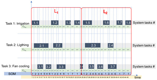 The frequency and duration of SOMs was estimated in fixed time-windows, in order to determine the regular number of occurrences of every SOM and their regular duration time in a standardized time length (L). This time length (L) should be set, according to: (i) main system tasks (processes), (ii) time required for tasks accomplishments and (iii) task sequences. A scheme that graphically represents system tasks versus their occurrence time is shown in Figure 2. This scheme depicts task sequences to determine if there are patterns in terms of duration time, parallel occurring tasks, sequence of occurrence, and time between task occurrences. It also allows observing the occurring SOMs and their sequences based on the deployment of the parallel system tasks. For the sake of clearness, we used the case of a cyber-physical greenhouse as example in Figure 2. Nevertheless, this approach could be used in any small-scale CPS.