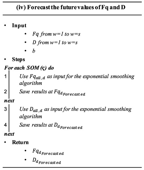 This step (detailed in algorithm (iii) shown in the Figure 5) aims at forecasting the forthcoming values of and based on their historic records. With this objective in mind, a time series-based forecasting model is proposed to extrapolate and of each SOM in a future time interval , where b denotes the forecasting horizon. This process can be described as: