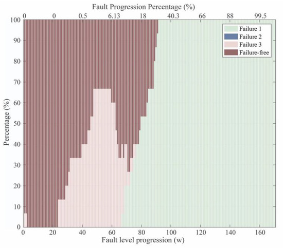 The results of the investigation are graphically presented in a bar-plot in Figure 15. Every single bar represents the distribution of the predicted failures for the analyzed scenarios (15 scenarios) in every step . A code of colors indicates the predicted failure modes, as it is shown in the legend. The distribution of the analyzed experiments is presented in the y-axis, while the x-axis represents both, the fault progression (w) and the fault progression percentage (FPP). FPP expresses the advancement of the fault formation and it was estimated by considering the progression step as the fault size = 100%.