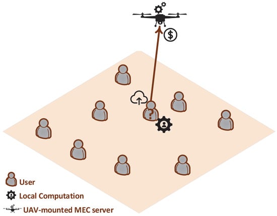 Combined with the MEC concept, Unmanned Aerial Vehicles (UAVs), equipped with communication and computing facilities, become a core component of next generation networks due to their salient attributes, such as hovering ability, flexibility and effortless deployment, maneuverability, mobility, low cost, strong line-of-sight (LoS) connection links, adjustable usage, and adaptive altitude []. The MEC servers are embedded in the UAVs that fly in closer proximity to the users compared to the conventional MEC servers typically residing at the Macro Base Stations (MBSs) of the macrocells or at the Access Points (APs) of the small cells []. Thus, the UAV-mounted MEC servers more efficiently support the end users applications’ data offloading and processing at the flying edge servers, by creating a flexible and dynamic computing environment paradigm [].
