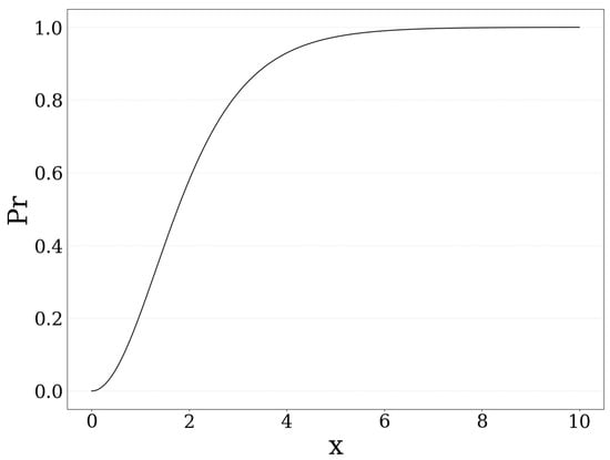 It is noted that the rest of the paper’s analysis still holds true for any probability of failure function that is characterized by the properties described above and the selection of the square function for the probability of failure is mainly made for presentation purposes. Accordingly, the UAV-mounted MEC server’s probability to survive and process the users’ total amount of offloaded data are . Moreover, due to the nature of the user’s total computation demand (Equation (6)), the UAV-mounted MEC server’s probability of failure (Equation (10)) is convex on low to medium users’ computation demand and concave on high demand, while it asymptotically converges to one, as shown in Figure 2.