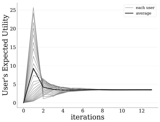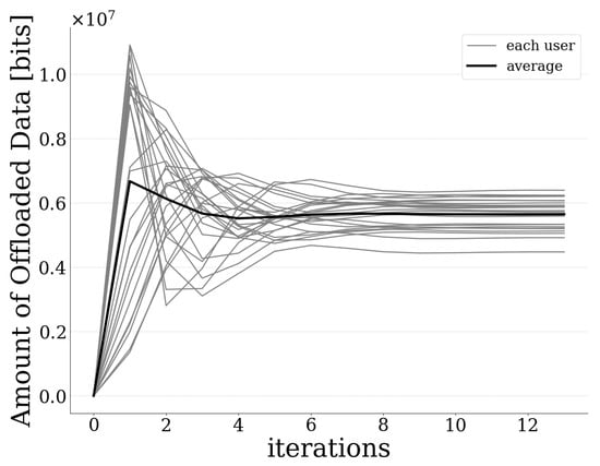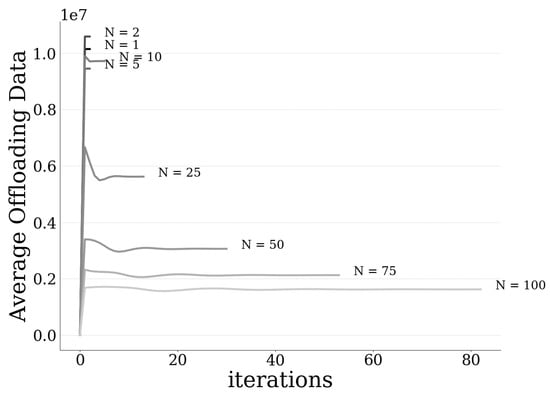 In this section, a scalability evaluation of the proposed pricing and risk-aware data offloading framework is provided considering an increasing number of users in the system. Table 2 presents the iterations and the overall corresponding execution time of the proposed algorithm in order to converge to the PNE point. Given the distributed nature of the best response dynamics approach, we observe that its execution time scales quite well for increasing number of users, achieving a close to real-time implementation in realistic scenarios. Respectively, the users’ average expected utility, the users’ average amount of offloaded data, and the imposed pricing by the UAV-mounted MEC server are presented in Figure 10, as a function of the number of users. The scalability evaluation is complemented by the results presented in Figure 11 that depict the convergence of the users’ average amount of offloaded data as a function of the required number of iterations, for different numbers of users. In particular, we observe that, as the number of users in the system increases, they tend to offload a lower average amount of data to the MEC server (Figure 10 and Figure 11), as the latter becomes over-congested. Thus, they experience both lower pricing (Figure 10) and lower expected utility (Figure 10), as they drive themselves in processing more data locally on their local devices and accordingly consume their own resources, i.e., battery. It is also observed that the user’s experienced pricing and the user’s offloaded data (Figure 10) has the same trend, due to their one-to-one relationship stemming from Equation (3), while the corresponding curves also appear to be overlapping. However, it should be noted here that the actual values for the two curves are different, since there are two different right vertical axes in Figure 10 (each one reflecting the values of each curve respectively).