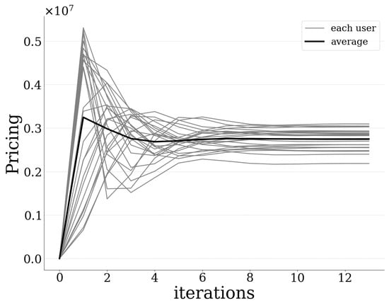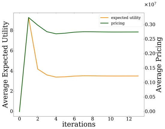 Average users’ expected utility and average users’ pricing vs. iterations.