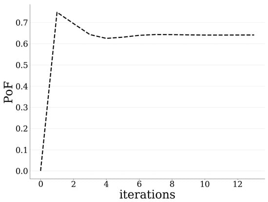 Figure 6 depicts the users’ average expected prospect-theoretic utility and the users’ average experienced usage-based pricing for exploiting the UAV-mounted MEC server’s computing capabilities, as a function of the algorithm’s iterations. In addition, Figure 7 presents the UAV-mounted MEC server’s probability of failure as a function of the algorithm’s iterations. The above described trend in users’ data offloading strategies is observed from the system’s point of view. Specifically, all the users tend initially to aggressively offload a large amount of data to the MEC server in order to achieve a greater utility (Figure 6). However, the probability of failure of the UAV-mounted MEC server increases due to the over-exploitation of its computing capabilities (Figure 7). Thus, the MEC server imposes a higher pricing on the users (Figure 6) to control their greedy and selfish data offloading behavior.