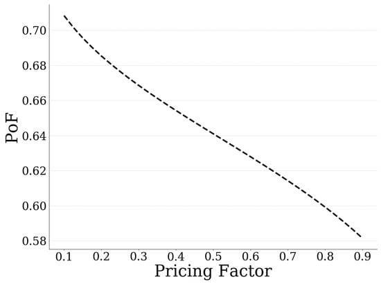 Based on the results presented in Figure 9, it is observed that the users’ average expected utility is concave with respect to the pricing factor. Specifically, small values of the pricing factor correspond to less-strict pricing policies; thus, the users over-exploit the MEC server’s computing capabilities (i.e., high values of MEC server’s probability of failure are observed), resulting in low values of expected utility. On the other hand, high values of the pricing factor result in discouraging the users to exploit the UAV-mounted MEC server’s computing capabilities, thus concluding again to low levels of users’ average expected utility. Therefore, a balanced pricing policy is required to keep the quality of experience of the users at high levels.