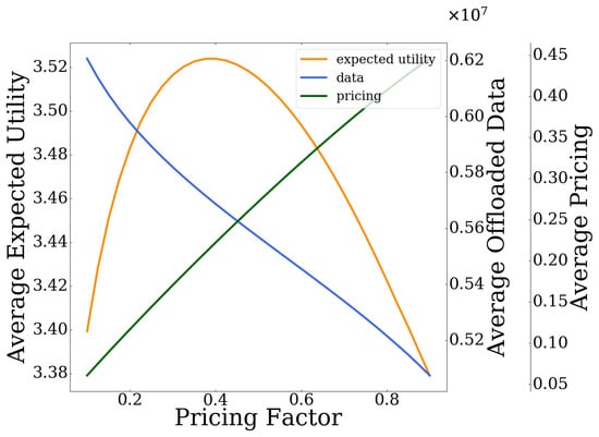 Average expected utility, offloaded data, and pricing vs. the pricing factor.