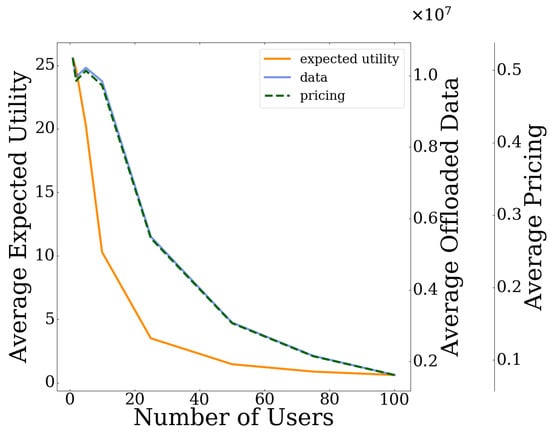 Users’ average expected utility, users’ average offloaded data and pricing at the PNE vs. number of users on the system.