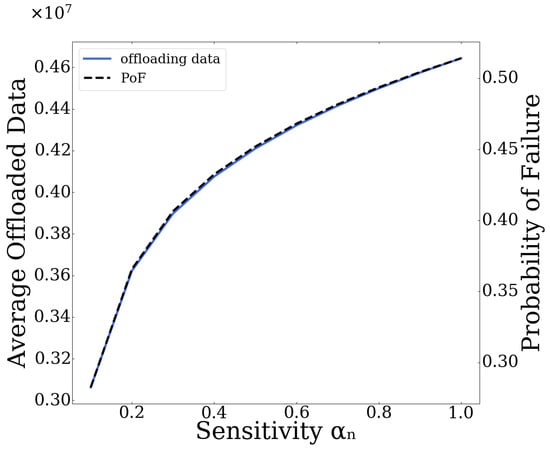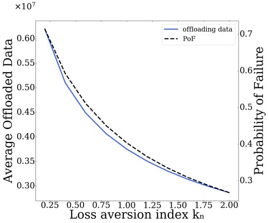 Specifically, in Figure 12 and Figure 13, initially we present the average user offloaded data and corresponding Probability of failure, as functions of the sensitivity parameter and the loss aversion index , respectively. As can be seen from Figure 12, by increasing the sensitivity parameter , the users tend to offload more data to the MEC server since they opt to value more the larger gains, compared to those of smaller magnitude. The increased volume of data offloaded results in an increase in the corresponding Probability of Failure of the server as well. In Figure 13, on the other hand, we can see that, as the loss aversion index increases, less data are offloaded to the server, since higher value signifies more loss aversion for the users, resulting in smaller Probabilities of Failure of the server.