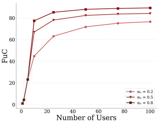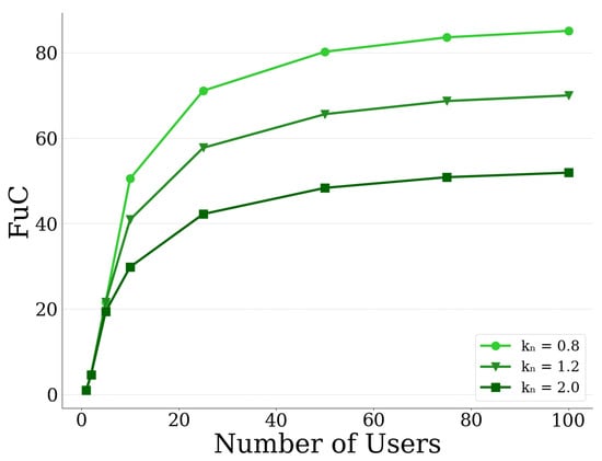 In Figure 14 and Figure 15, we present the FuC metric as a function of the number of users in the system, for different values of the sensitivity parameter and the loss aversion index , respectively. In both figures, we observe that, as the number of users increases, the FuC increases as well, since more users are competing for the CPR and consequently more data are offloaded to the server, until it eventually plateaus. Concerning the effect that the prospect theoretic parameters have on the FuC metric, in Figure 14, we can see that the higher the value of the sensitivity parameter , the higher the FuC as well. This is justified by the fact that, the higher the values of , the greater the sensitivity of the users towards gains and losses of higher magnitude compared to those of smaller magnitude (Figure 12). As a result, users tend to offload more data to the MEC server and the server is more prone to failure, and accordingly an increase in FuC is expected. With respect now to the loss aversion index , we can see in Figure 15 that, as increases, the FuC decreases. This is due to the fact that, as increases, users become more loss averse and thus they tend to offload less data to the MEC server in order to avoid potential failure as already shown in Figure 13. The less data are offloaded to the server, the less the probability that the server will fail, thus resulting in lower FuC. Furthermore, based on the results of Figure 14 and Figure 15, the FuC appears initially more sensitive to the number of users in the case compared to , our setting and experiments. It is clarified that the overall observed increasing trend of the FuC w.r.t. to the increasing number of users in these figures is well aligned with the fact that the failure probability is an increasing function of the total offloaded data of all users. However, the actual slope of the corresponding curves mainly depends on the used values for and for the generation of these curves, which are selected here only for demonstration purposes, and are not correlated with each other in any way.